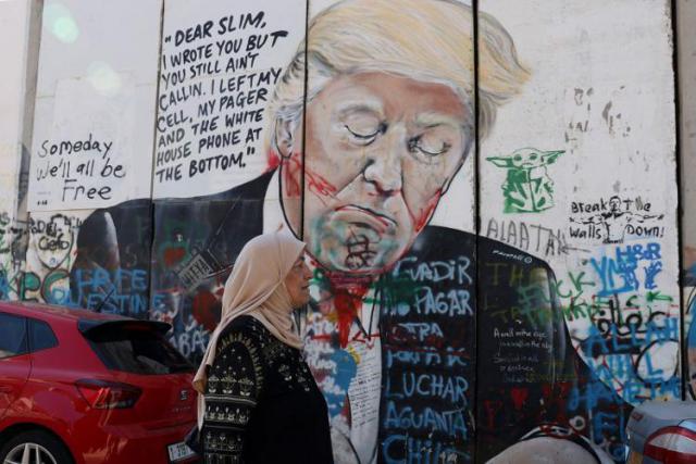 2024 年 11 月 5 日,约旦河西岸伯利恒,一名巴勒斯坦女人走过一幅描绘特朗普的壁画。来源:视觉中国
